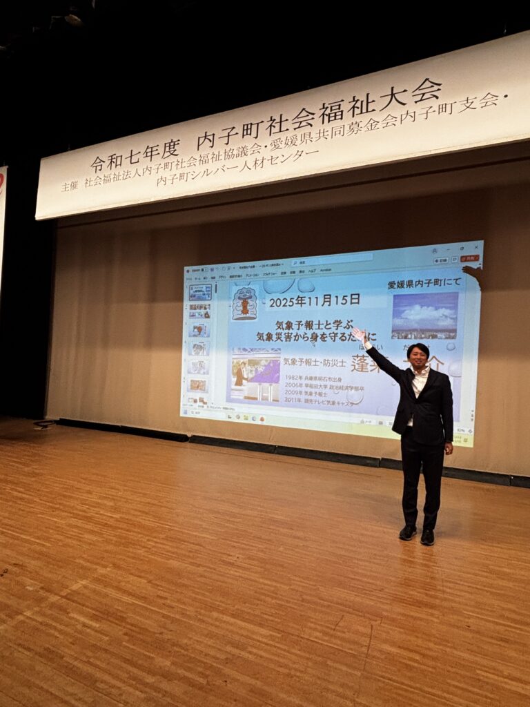 2025年11月17日 / 最終更新日時 : 2025年11月17日 daisukehourai 活動報告 11月16日愛媛県内子町にて講演 防災の話し、その土地の過去の災害、来年春に新しく変わる気象警報の解説などなど盛りだくさんの90分でした 高気圧で晴れたこの日、早朝は霧が発生しやすい場所 日が出てくるのは、昼前になってから! 旅の鞄はHerschelです。もう10年くらい使っているかも