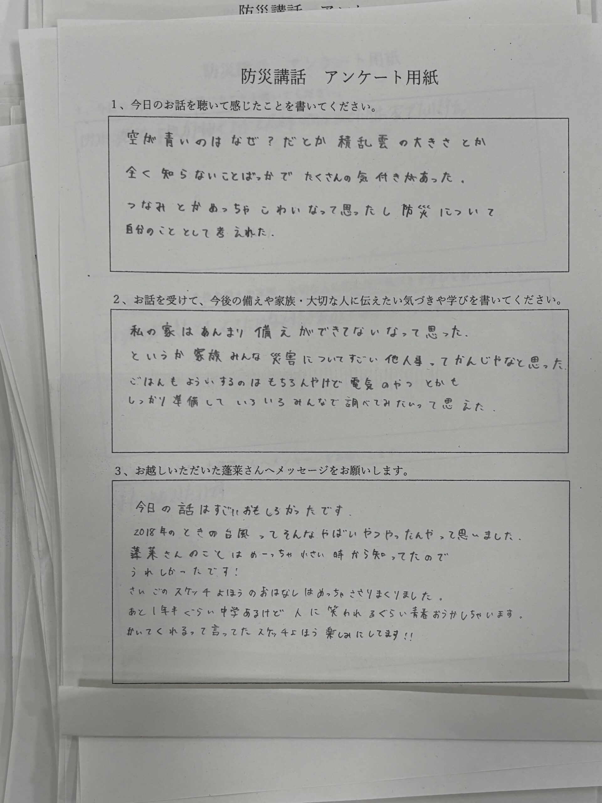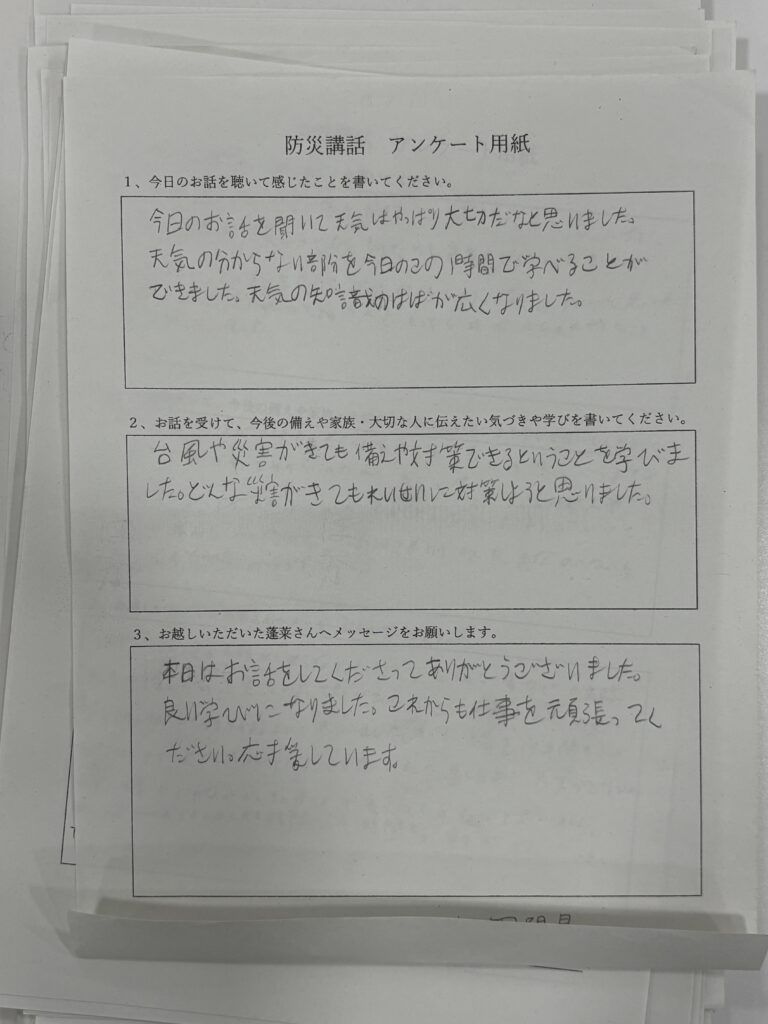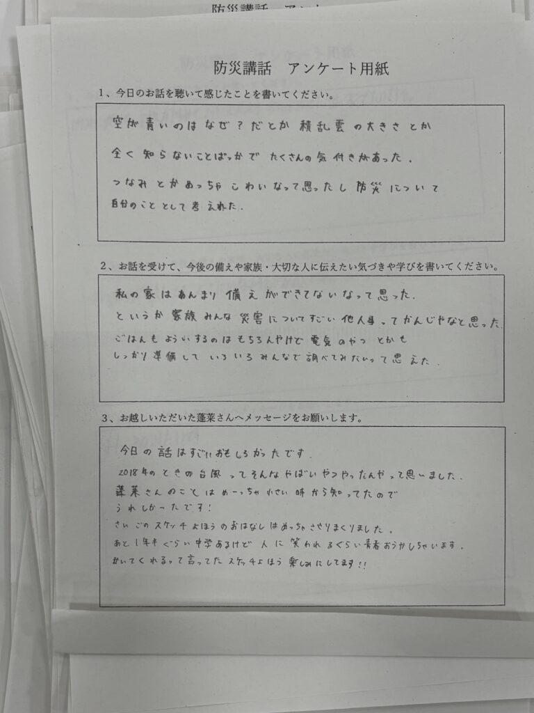 2025年11月27日 / 最終更新日時 : 2025年11月27日 daisukehourai その他 講演の感想:中学2年生 この年代は防災の話しだけでなく、気象の仕組みなども入れると理解しやすいようです